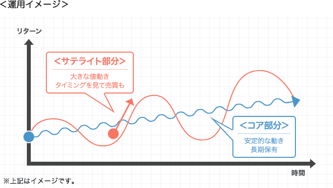 コアサテライト運用とは、運用資産をコアとサテライトの2つに分けて考える運用手法のこと。コア部分では安定的な成長をはかり、一方のサテライト部分では比較的高いリターンを目指して運用を行います。